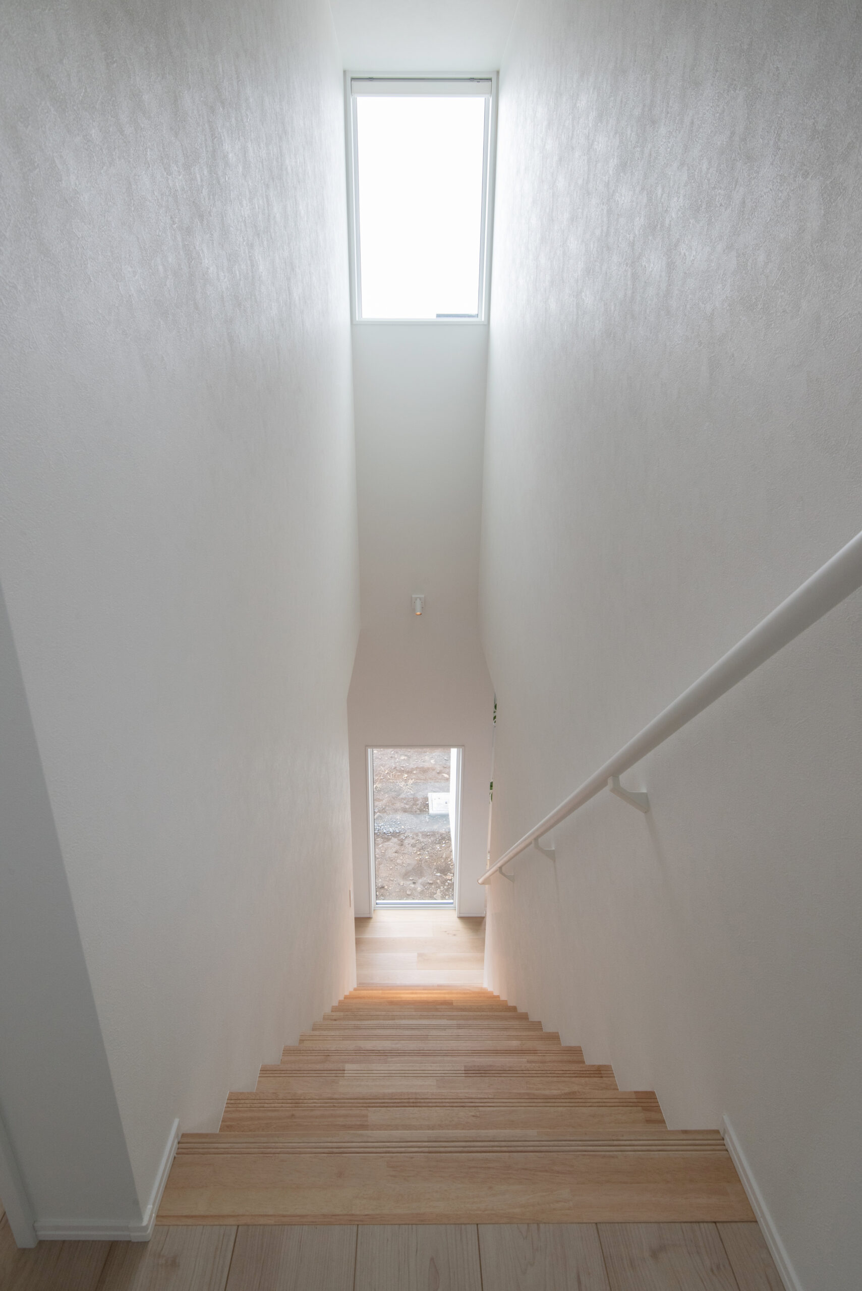 階段を登り切って振り返ると、南にFIX窓があります。自然光に照らされた明るい階段スペースです。