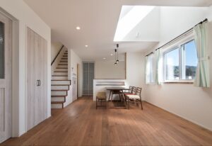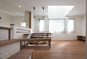 白い壁がお部屋の明るさと木の質感や重厚感のあるブラウンが際立つLDKには、天井からの風光がおうち全体に流れるように設計した吹き抜けも。