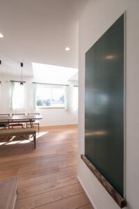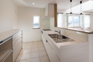 使いやすさと収納と見た目、リビングにも繋がる開放的な白のキッチンと、ダイニングの近くの壁には、家族の掲示板にもできるこだわりの黒板を設置しました。