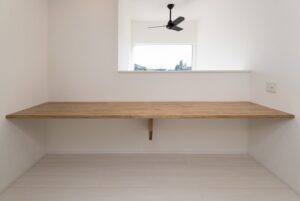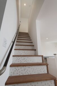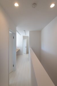 モザイクタイルとホワイトとブラウンの2色基調色がアクセントの階段から2Fにあがると、フリースペースとしても活用できる2階ホールや、吹き抜けの先にあるフリースペースが。お子様の勉強やパパの趣味のスペースとしても使えます。