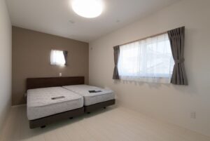 ブラウンの落ち着いたアクセントが部屋の奥行きを演出する寝室に、たっぷりの収納スペース・クローゼットなども。