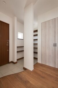 玄関外部も屋根を大きく取り、雨をしのげるようにしました。