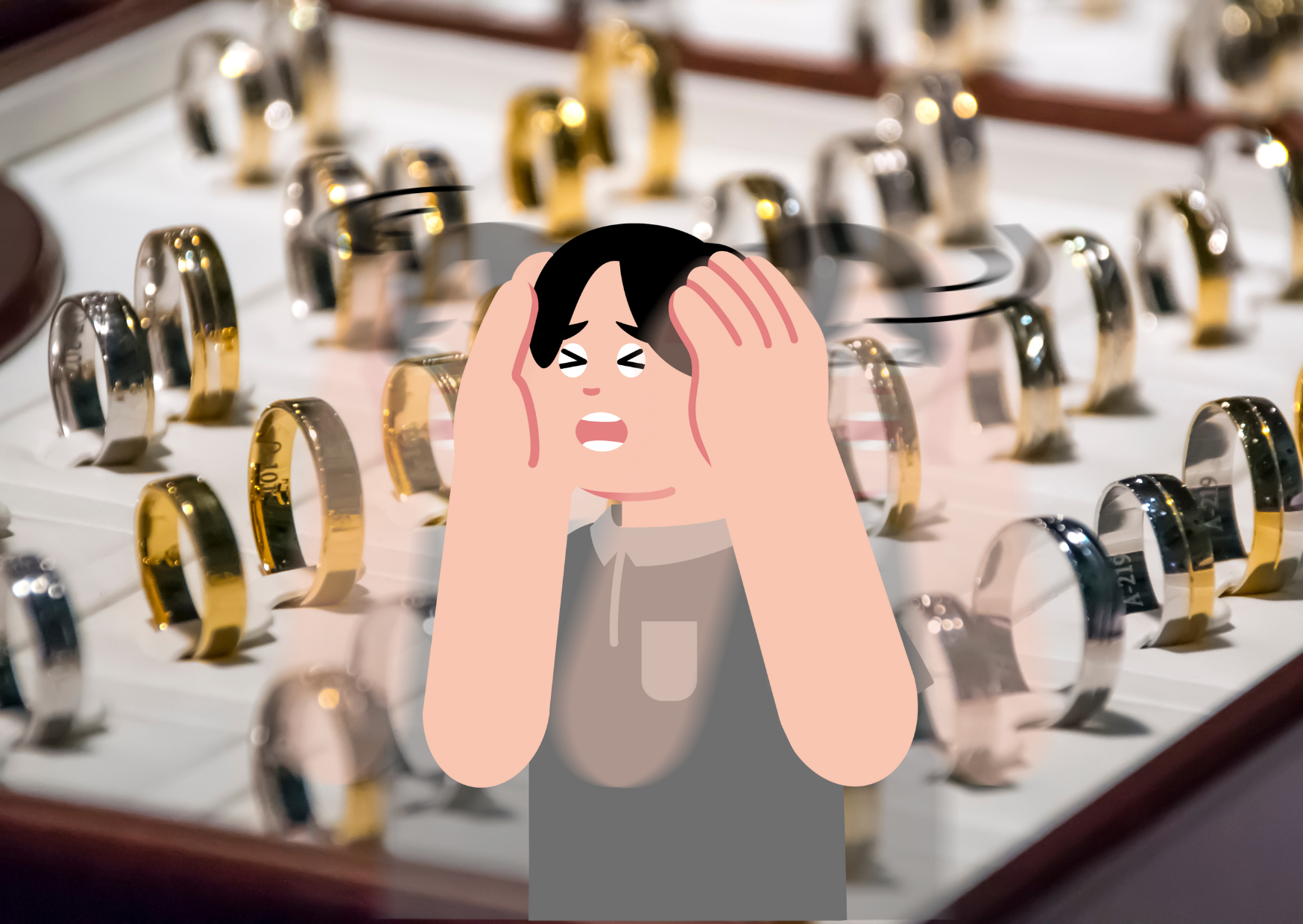ここで沢山の指輪のサンプルを見ながら「デザイン・素材・内側に掘る文字やイラスト」を決めました。