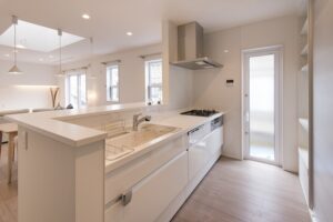 キッチン側から望むリビングダイニングは、家族の様子が見渡せ、キッチンは料理をしながら、家族との時間を楽しめるシンプルな対面式で、たっぷり収納ができるパントリーも。