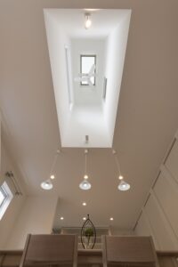 優しい太陽光と風が抜ける吹き抜けは、2階の廊下とベランダから覗くと、リビングダイニングが見えます。