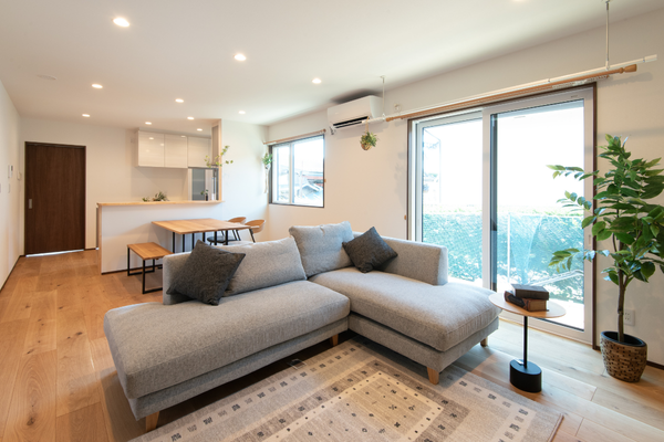 リビングには室内干し用の物干しを設置し冬は床暖房のある室内で即乾燥!