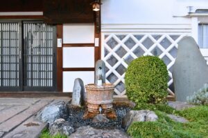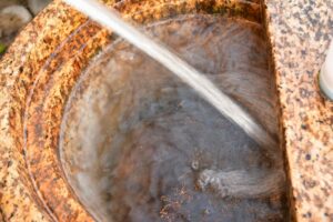 商店街を歩いていくと、旧酒蔵の入り口横に水場があります。
